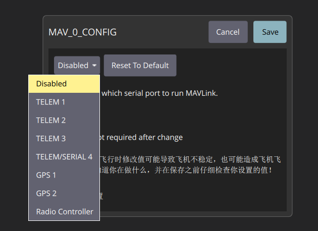 2) PX4的电台串口,需要先开启特定参数后,才能配置.飞控支持3路串口配置为Mavlink,可以分别对  MAV_0_CONFIG、MAV_1_CONFIG、MAV_2_CONFIG三个参数进行配置,如下: