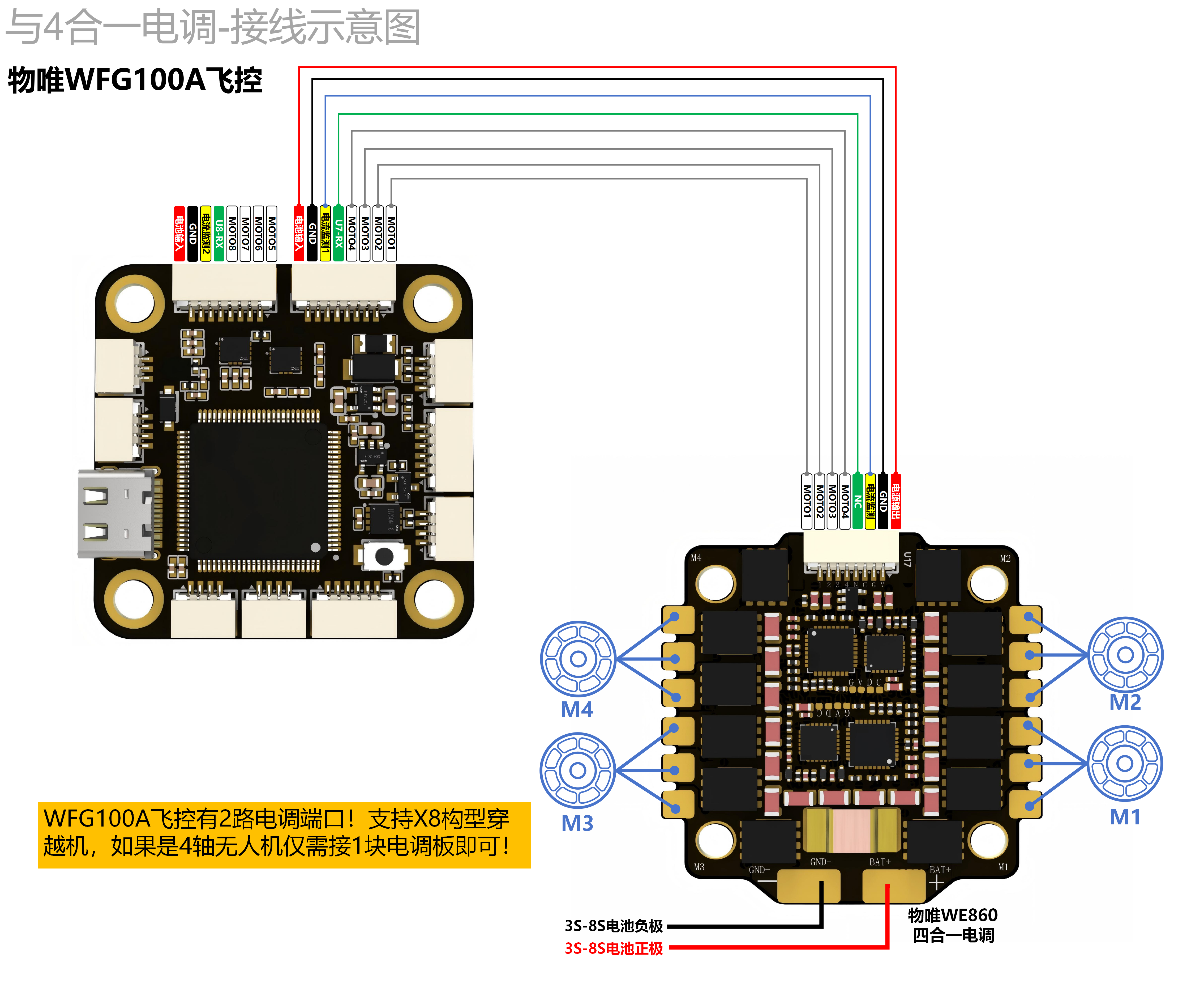 知识库 / WFG100飞控-资料汇总(开源)3、WFG100外设接线示意图注:WFG100A飞控的V1,V2,V3,V4这四个版本的飞控 硬件,其接口线序和接线示意图都是一样!注:WFG100A飞控的V1,V2,V3,V4这四个版本的飞控 硬件,其接口线序和接线示意图都是一样!相关文档1、WFG100-立创工程汇总一、硬件版本更新说明 几个硬件版本的差异主要体现在传感器型号上,V2/V3/V4的PCB工程都是一致的! 详见: 《WFG100A飞控各个硬件版本的区别!》 汇总时间 版本 硬件设计资料 2026.4 V4版 当前销售的是V4版本! 由于国...2、WFG100接口线序、焊盘定义图前言 WFG100A开源飞控的V1、V2、V3、V4其接口定义与焊盘定义都是一样的! 一、接口定义 飞控对外接口均采用 SH1.0端子 ,其端子的接口线序定义如下: 注意:飞控板载的电源,最大支持3S-6S的电池输入! 二、焊盘定义 本文被...4、WFG100用户手册WFG100飞控使用说明书 注意: 在开源V1版本中(在开源V2版本中,则直接移除了这个保护,USB通电后便会有5V输出) 为防止外设的大电流烧坏电脑USB口,USB供电与外设供电做了隔离! 飞控必须接入电池后,SH1.0端子连接器上的5V...