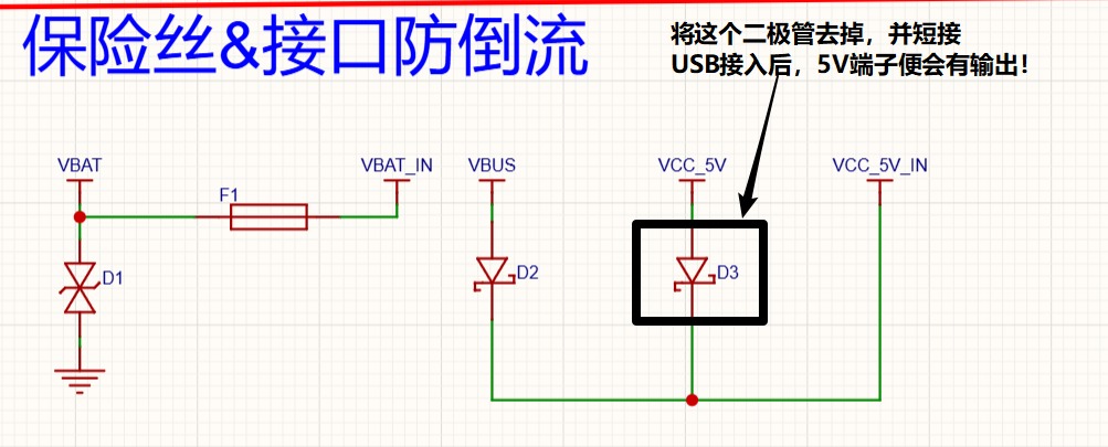 如果不要这个保护,想要插入USB线,就有5V输出。只需要去掉一颗D3二极管,并短接二极管上的两个焊盘即可,如下图所示: