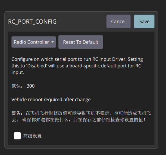 3) 必须要有1路串口作为遥控器的接收机,通过参数RC_PORT_CONFIG进行设置端口。
