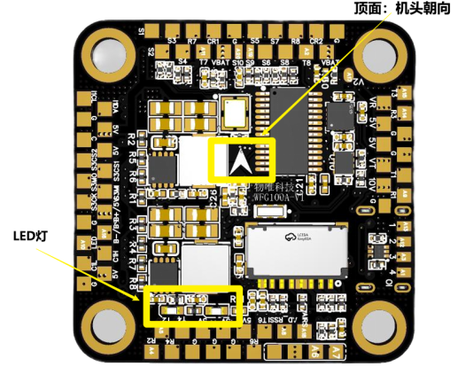 为了统一WFG100A飞控的安装方向,因为我们在AP、PX4、INAV、BF四个飞控固件的源码中默认将有LED灯、有焊盘的一面,作为飞控的顶面。